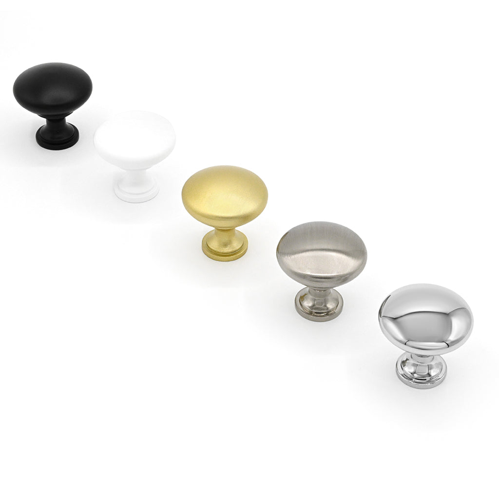 Produced from zinc alloy, these versatile cabinet knobs are available in multiple finishes including satin nickel, polished chrome, matt black, matt white and brushed gold to match a range of kitchen, bathroom, bedroom and wardrobe and furniture styles.