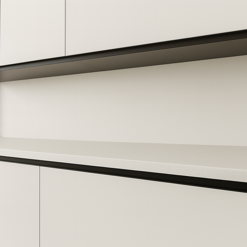 Our 442 series Yaroomba Shadowline handleless cabinet rail is designed for modern minimalist interiors, delivering a seamless, integrated aesthetic by sitting behind the cabinet front with no protrusions, just clean lines.
